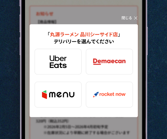 - 店舗によって利用できるデリバリーサービスが異なります