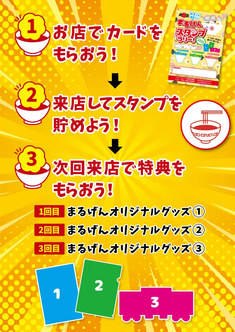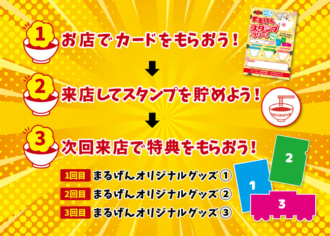 期間中、店頭にて配布するスタンプラリーのカードを持ってご来店いただいたお子さまに、丸源オリジナルグッズをプレゼントいたします。