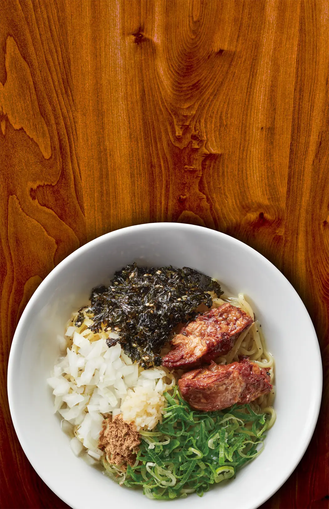 もちもちの中太麺に、丸源自慢の熟成醤油と、甘み・旨みの強い油が絡み合い、素材の味を 存分に堪能できる一杯に仕上げました。 今年より専用トッピングも追加し、卓上の調味料も併せて自分好みの味わいを楽しめる商品です。