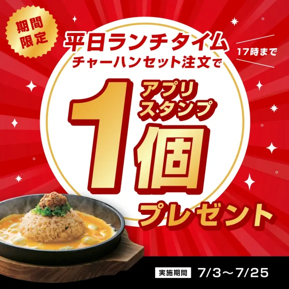 7月3日(木)より期間限定で、一番人気の【チャーハンセット】をご注文のお客様に、 アプリスタンプをもう1個プレゼントいたします。