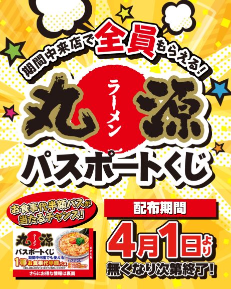 本日より丸源ラーメンで「パスポートくじ」を配布いたします!